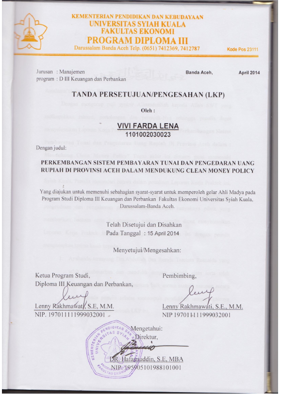 VIVI FARDA LENA, PERKEMBANGAN SISTEM PEMBAYARAN TUNAI DAN PENGEDARAN UANG RUPIAH DI PROVINSI ACEH DALAM MENDUKUNG CLEAN MONEY POLICY PADA KANTOR PERWAKILAN BANK INDONESIA BANDA ACEH. Banda Aceh Fakultas Ekonomi,2014