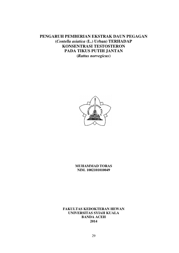 PENGARUH PEMBERIAN EKSTRAK DAUN PEGAGAN (CENTELLA ASIATICA (L.) URBAN) TERHADAP KONSENTRASI TESTOSTERON PADA TIKUS PUTIH JANTAN RN(RATTUS NORVEGICUS)RNTHE EFFECT OF PEGAGAN LEAF EXSTRACT (CENTELLA ASIATICA (L.) URBAN) ADMINISTRATION ON TESTOSTERONE CONCENTRATION OF MALE RNWHITE RATS (RATTUS NORVEGICUS). Banda Aceh Fakultas Kedokteran Hewan,2014