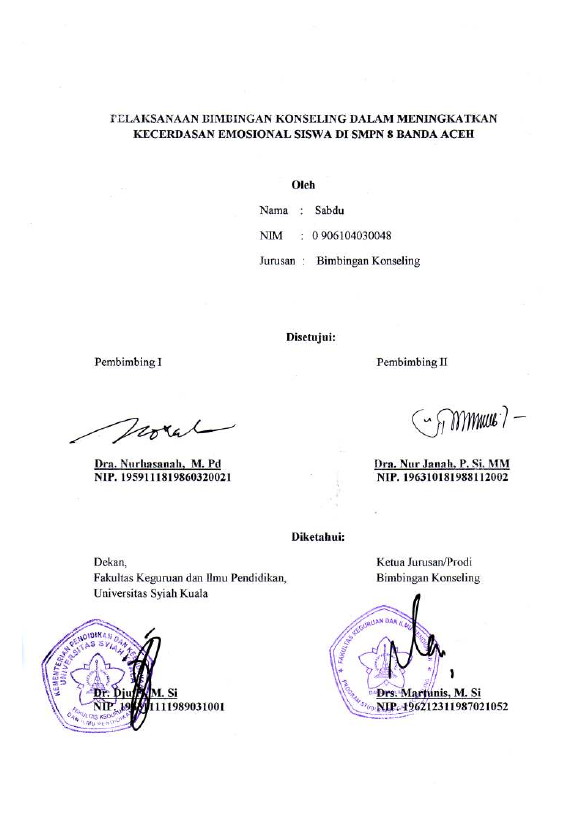 Sabdu , PELAKSANAAN BIMBINGAN KONSELING DALAM MENINGKATKAN KECERDASAN EMOSIONAL SISWA DI SMPN 8 BANDA ACEH. Banda Aceh Fakultas Keguruan dan Ilmu Pendidikan,2014