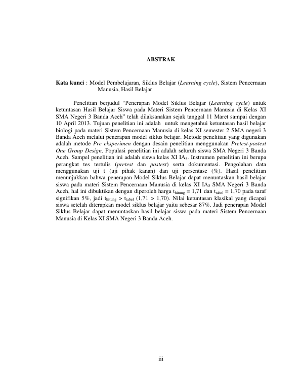 Amalia Susana, PENERAPAN MODEL SIKLUS BELAJAR (LEARNING CYCLE) UNTUK KETUNTASAN HASIL BELAJAR SISWA PADA MATERI SISTEM PENCERNAAN MANUSIA DI KELAS XI SMA NEGERI 3 BANDA ACEH. Banda Aceh Fakultas Keguruan dan Ilmu Pendidikan,2013