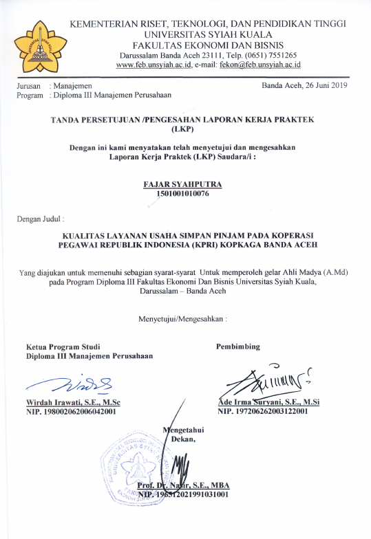 FAJAR SYAHPUTRA, KUALITAS LAYANAN USAHA SIMPAN PINJAM PADA KOPERASI PEGAWAI REPUBLIK INDONESIA (KPRI) KOPKAGA BANDA ACEH. Banda Aceh FAKULTAS EKONOMI BISNIS UNIVERSITAS SYIAH KUALA,2019