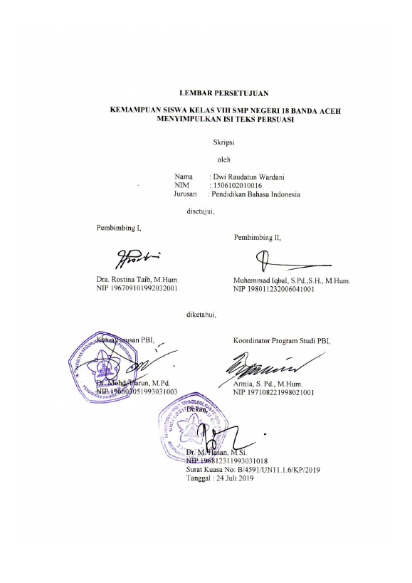 Dwi Raudatun Wardani, KEMAMPUAN SISWA KELAS VIII SMP NEGERI 18 BANDA ACEH MENYIMPULKAN ISI TEKS PERSUASI. Banda Aceh Universitas Syiah Kuala,2019