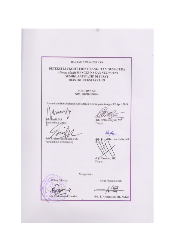 Meuthya Sr, DETEKSI LEUKOSIT URIN ORANGUTAN SUMATERA (PONGO ABELII)MENGGUNAKAN STRIP TEST SEMIKUANTITATIF DIPUSAT REINTRODUKSI JANTHO. Banda Aceh Fakultas Kedokteran Hewan,2014
