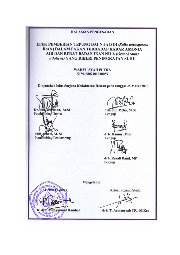 Baca Juga : PENGARUH PEMBERIAN TEPUNG DAUN JALOH (SALIX TETRASPERMA ROXB) TERHADAP TINGKAT KEMATIAN PADA IKAN NILA (OREOCHROMIC NILOTICUS) PADA KONDISI PANAS YANG DIINJEKSIKAN BAKTERI AEROMONAS HYDROPHILA (EVI WULANDARI, S.KH, 2015)