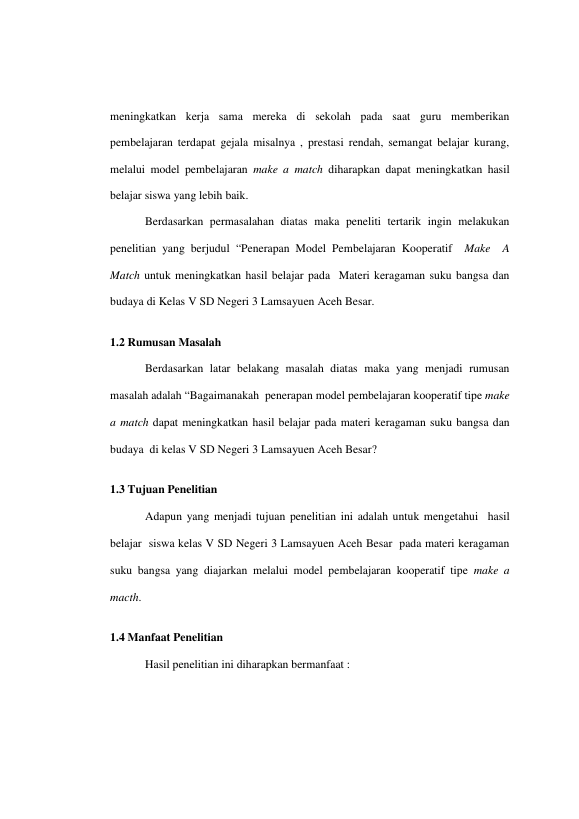 rahmat ikhsan saputra, PENERAPAN MODEL PEMBELAJARAN KOOPERATIF TIPE MAKE A MATCH UNTUK MENINGKATKAN HASIL BELAJAR PADA RNMATERI KERAGAMAN SUKU BANGSA DAN BUDAYA RNDI KELAS V SD NEGERI 3 LAMSAYUEN RNACEH BESAR. Banda Aceh Fakultas Keguruan dan Ilmu Pendidikan,2014