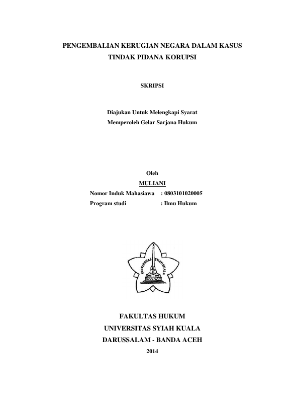 Muliani, PENGEMBALIAN KERUGIAN NEGARA DALAM KASUSRNTINDAK PIDANA KORUPSI. Banda Aceh Fakultas Hukum,2014