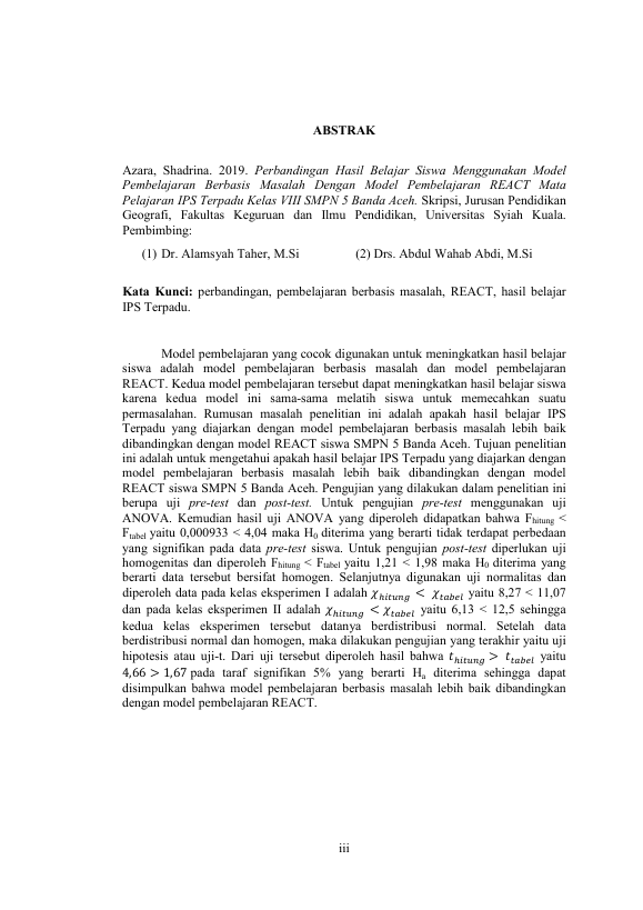 Baca Juga : PERBANDINGAN HASIL BELAJAR SISWA DENGAN MENGGUNAKAN MODEL PEMBELAJARAN REACT DAN QUANTUM TEACHING DALAM MATA PELAJARAN IPS TERPADU DI SMP NEGERI 8 BANDA ACEH (Amalia Husna, 2017)