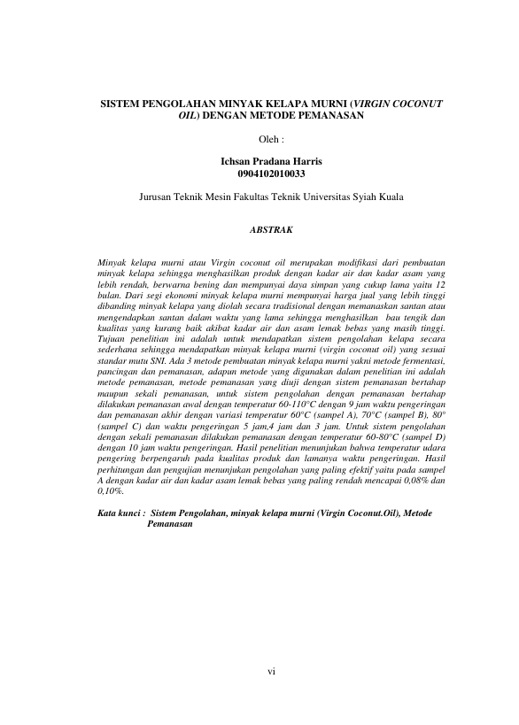 Ichsan Pradana Harris, SISTEM PENGOLAHAN MINYAK KELAPA MURNI (VIRGIN COCONUT OIL) DENGAN METODE PEMANASAN. Banda Aceh Fakultas Teknik,2014