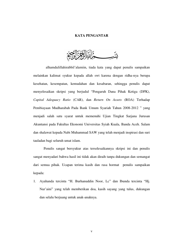 Mhd.Miqdad, PENGARUH DANA PIHAK KETIGA (DPK), CAPITAL ADEQUACY RATIO (CAR), DAN RETURN ON ASSETS (ROA) TERHADAP PEMBIAYAAN MUDHARABAH PADA BANK UMUM SYARIAH TAHUN 2008-2012. Banda Aceh Fakultas Ekonomi,2014