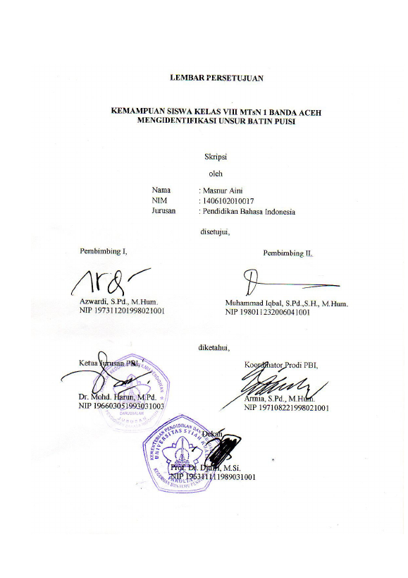 Masnur Aini, KEMAMPUAN SISWA KELAS VIII MTSN 1 BANDA ACEH MENGIDENTIFIKASI UNSUR BATIN PUISI. Banda Aceh Universitas Syiah Kuala,2020