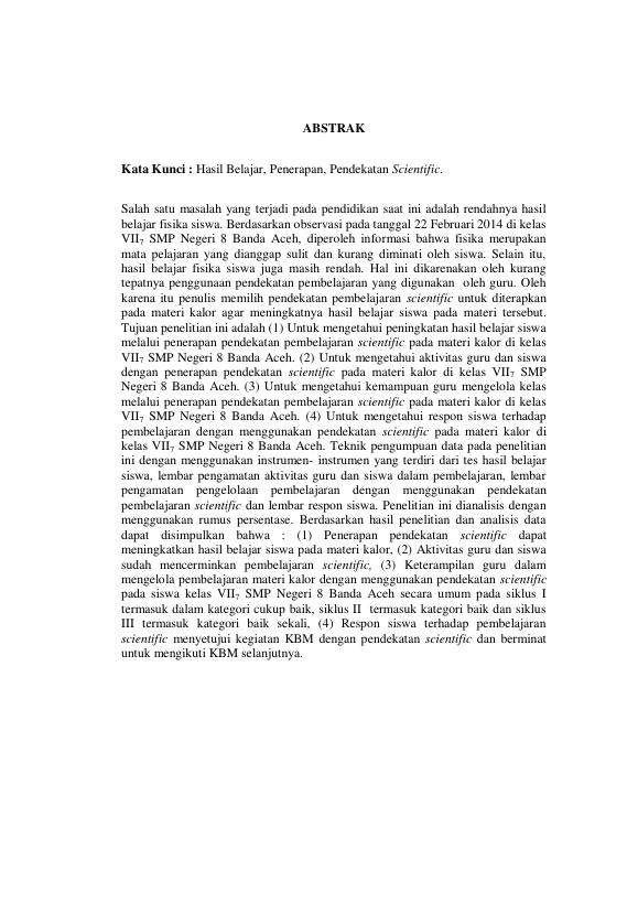 Baca Juga : EFEKTIVITAS PENERAPAN PENDEKATAN SCIENTIFIC TERHADAP KETERAMPILAN PROSES SAINS SISWA SMP NEGERI 3 BANDA ACEH PADA MATERI KALOR DAN PERPINDAHANNYA (Lia Safrida, 2014)
