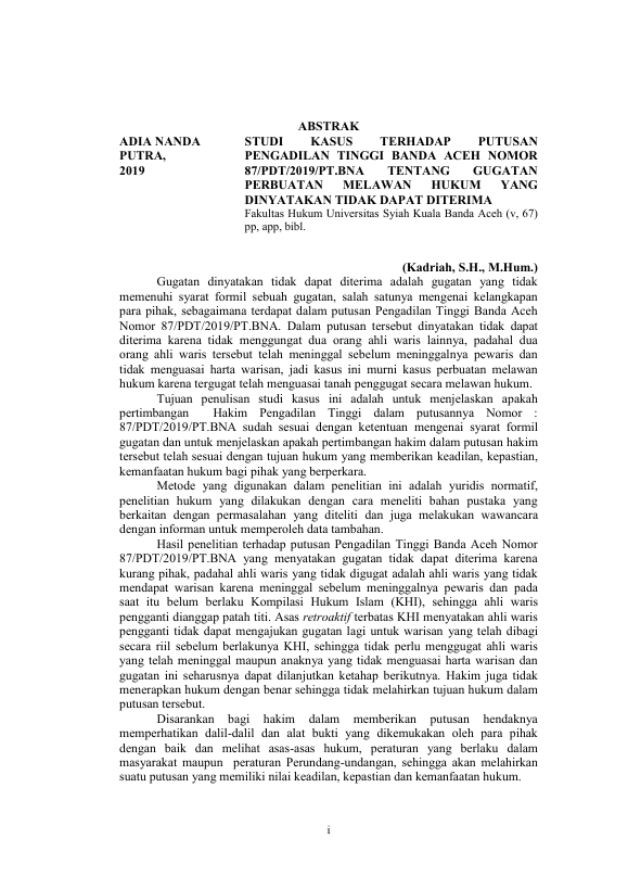 Baca Juga : STUDI KASUS TERHADAP PUTUSAN PENGADILAN TINGGI BANDA ACEH NOMOR 87/PDT/2019/PT.BNA TENTANG GUGATAN PERBUATAN MELAWAN HUKUM YANG DINYATAKAN TIDAK DAPAT DITERIMA (Adia Nanda Putra, 2020)