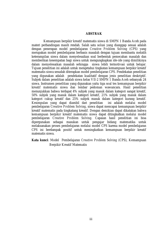 RAUZATUL JANNAH, KEMAMPUAN BERPIKIR KREATIF MATEMATIS SISWA MELALUI MODEL PEMBELAJARAN CREATIVE PROBLEM SOLVING (CPS) PADA MATERI PERBANDINGAN DI KELAS VII SMPN 1 BANDA ACEH. Banda Aceh Universitas Syiah Kuala,2020