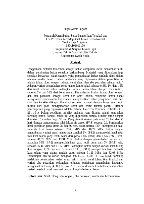 TEUKU RAJA ANGKASAH, PENGARUH PENAMBAHAN SERAT TULANG IKAN TOGKOL DAN ABU POZZOLAN TERHADAP KUAT TEKAN BETON NORMAL. Banda Aceh Universitas Syiah Kuala,2020