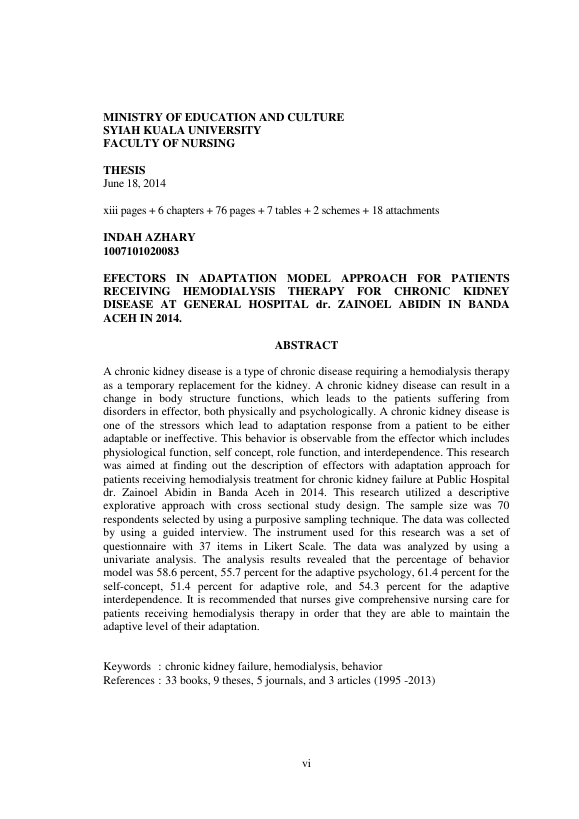 Baca Juga : PERILAKU DENGAN PENDEKATAN MODEL ADAPTASI PADA PASIEN GAGAL GINJAL KRONIK YANG MENJALANI HEMODIALISA DI RUMAH SAKIT UMUM DAERAH DR. ZAINOEL ABIDIN BANDA ACEH TAHUN 2014 (Indah Azhary, 2014)