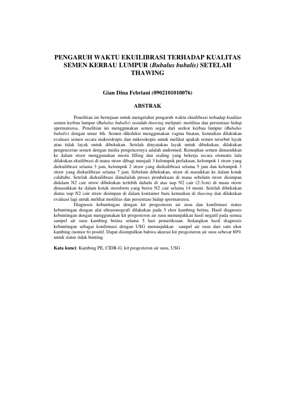 Gian Dina Febriani, PENGARUH WAKTU EKUILIBRASI TERHADAP KUALITAS SEMEN KERBAU LUMPUR (BUBALUS BUBALIS) SETELAH THAWING. Banda Aceh Fakultas Kedokteran Hewan,2013