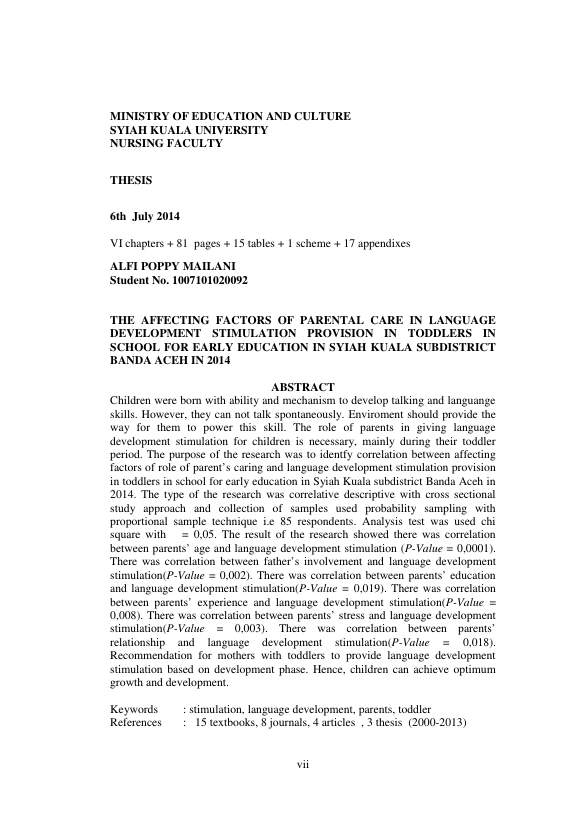 ALFI POPPY MAILANI, FAKTOR - FAKTOR YANG MEMPENGARUHI PENGASUHAN ORANGTUA DALAM PEMBERIAN STIMULASI PERKEMBANGAN BAHASA PADA ANAK USIA TODDLER DI PAUD KECAMATAN SYIAH KUALA BANDA ACEH TAHUN 2014. Banda Aceh Fakultas Keperawatan,2014
