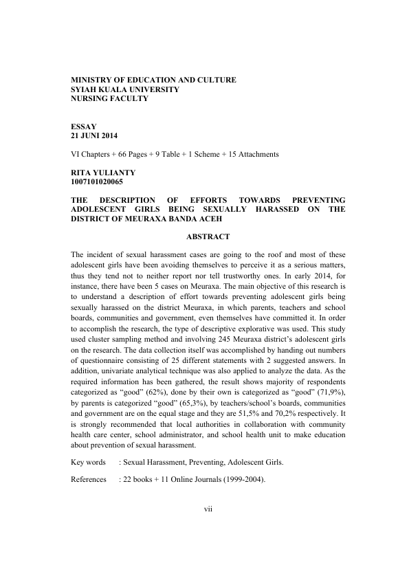 Rita Yulianty , GAMBARAN UPAYA PENCEGAHAN PELECEHAN SEKSUAL PADA REMAJA PUTRI DI KECAMATAN MEURAXA BANDA ACEH. Banda Aceh Fakultas Keperawatan,2014