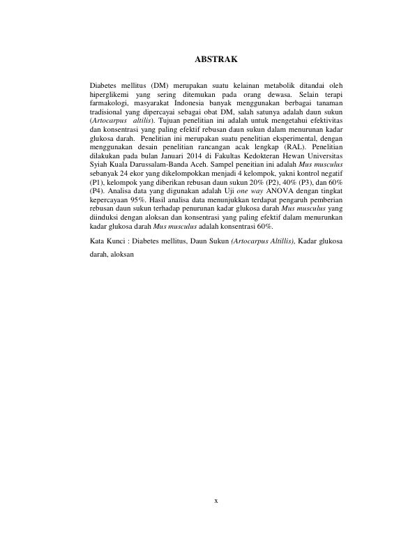 Muhammad Syariful Hamdi, PENGARUH PEMBERIAN REBUSAN DAUN SUKUN (ARTOCARPUS ALTILIS) TERHADAP PENURUNAN KADAR GLUKOSA DARAH MENCIT (MUS MUSCULUS) YANG DIINDUKSI ALOKSAN. Banda Aceh Fakultas Kedokteran,2014