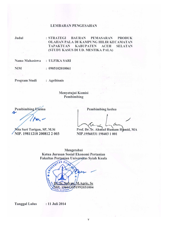 Ulfika Sari, STRATEGI BAURAN PEMASARAN PRODUK OLAHAN PALA DI KAMPUNG HILIR KECAMATAN TAPAKTUAN KABUPATEN ACEH SELATAN (STUDY KASUS DI UD. MESTIKA PALA). Banda Aceh Fakultas Pertanian,2014