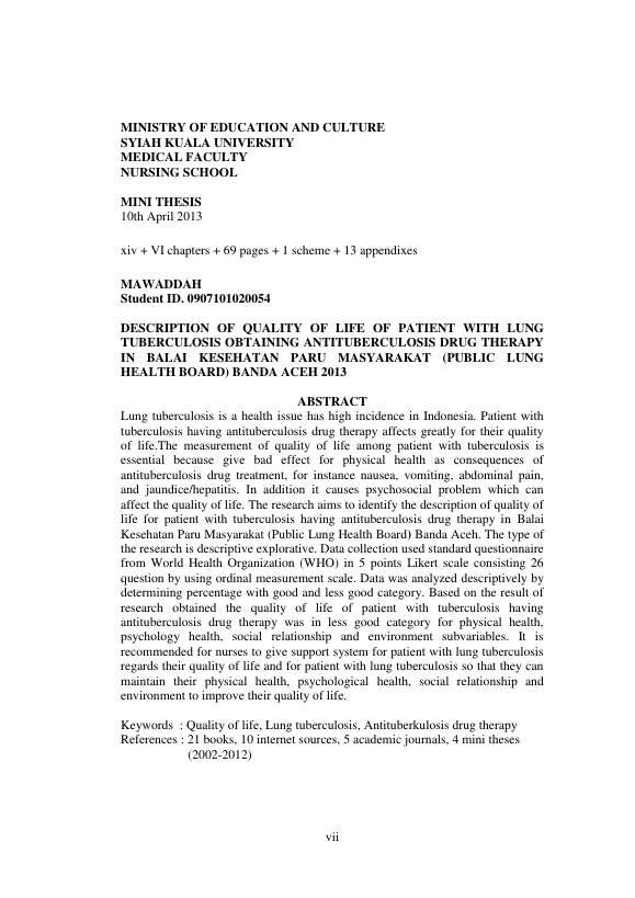 Mawaddah, GAMBARAN KUALITAS HIDUP PASIEN TUBERKULOSIS PARU YANG MENJALANI TERAPI OBAT ANTI TUBERKULOSIS DI BALAI KESEHATAN RNPARU MASYARAKAT (BKPM) RNBANDA ACEH TAHUN 2013. Banda Aceh Fakultas Keperawatan,2013