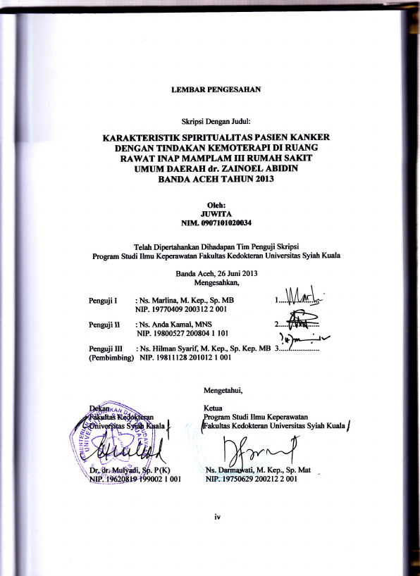 Baca Juga : KARAKTERISTIK SPIRITUALITAS PASIEN KANKER DENGAN TINDAKAN KEMOTERAPI DI RUANGRNRAWAT INAP MAMPLAM III RUMAH SAKITRNUMUM DAERAH DR. ZAINOEL ABIDINRNBANDA ACEH TAHUN 2013 (Juwita, 2022)