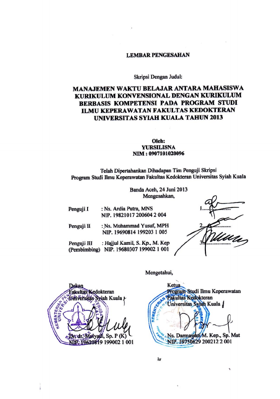 Yursilisna, MANAJEMEN WAKTU BELAJAR ANTARA MAHASISWA KURIKULUM KONVENSIONAL DENGAN KURIKULUM BERBASIS KOMPETENSI PADA PROGRAM STUDI ILMU KEPERAWATAN FAKULTAS KEDOKTERAN UNIVERSITAS SYIAH KUALA TAHUN 2013. Banda Aceh Fakultas Kedokteran,2013