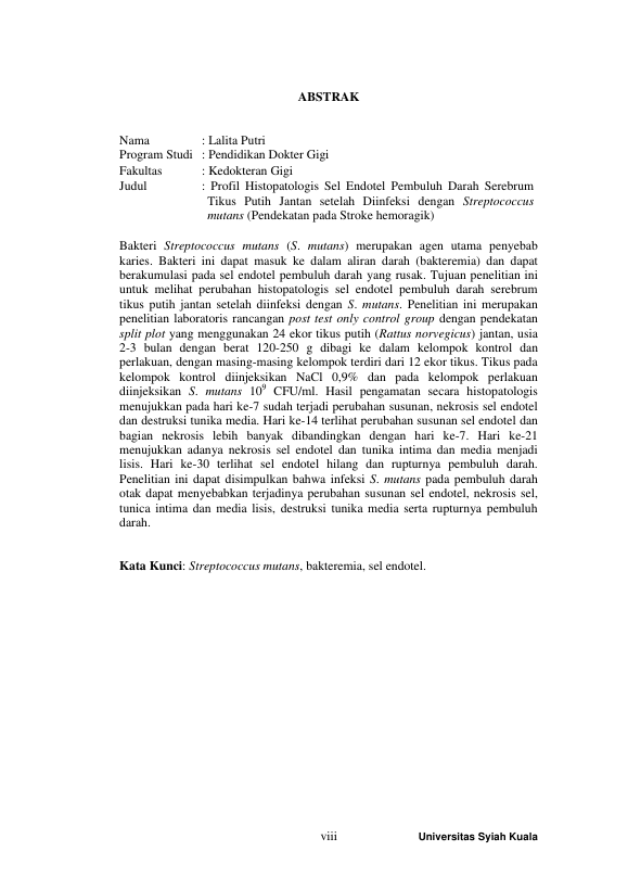 Baca Juga : GAMBARAN HISTOPATOLOGIS SEREBRUM TIKUS PUTIH GALUR WISTAR SETELAH DIINFEKSI DENGAN STREPTOCOCCUS MUTANS KAITAN DENGAN INFEKSI STROKE HEMORAGIK (Amalia Syabrina, 2014)