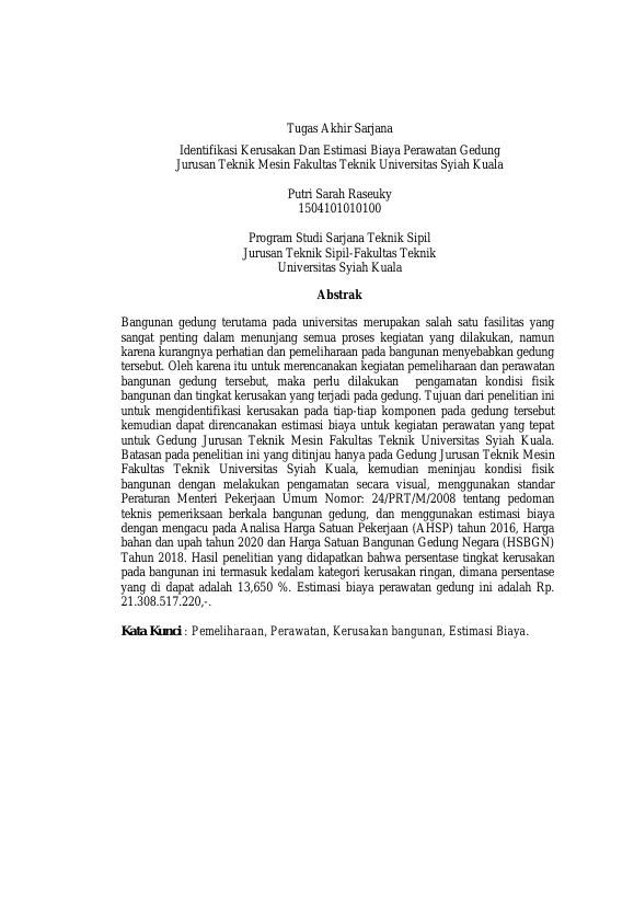 Baca Juga : ESTIMASI BIAYA PEMELIHARAAN BANGUNAN GEDUNG A FAKULTAS TEKNIK UNIVERSITAS SYIAH KUALA. (Dea Chikita Eriadi, 2020)