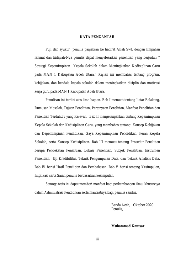 Muhammad Kautsar, STRATEGI KEPEMIMPINAN KEPALA SEKOLAH DALAM MENINGKATKAN KEDISIPLINAN GURU PADA MAN 1 KABUPATEN ACEH UTARA. Banda Aceh Universitas Syiah Kuala,2020
