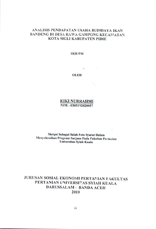 Kiki Nurrahmi, ANALISIS PENDAPATAN USAHA BUDIDAYA IKAN BANDENG DI DESA RAWA GAMPONG KECAMATAN KOTA SIGLI KABUPATEN PIDIE. Banda Aceh Universitas Syiah Kuala,2020