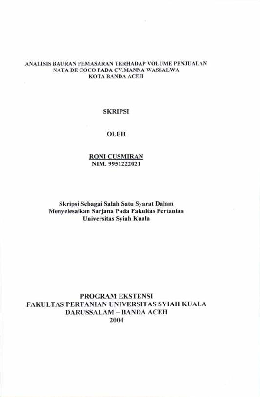 Roni Cusmiran, ANALISIS BAURAN PEMASARAN TERHADAP VOLUME PENJUALAN NATA DE COCO PADA CV.MANNA WASSALWA KOTA BANDA ACEH. Banda Aceh Universitas Syiah Kuala,2020
