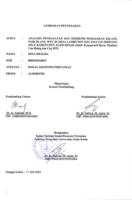 Dina Meilisa, ANALISIS PENDAPATAN DAN EFISIENSI PEMASARAN KILANG PADI BLANG WEU DI DESA LAMBUNOT KECAMATAN SIMPANG TIGA KABUPATEN ACEH BESAR (STUDI KOMPARATIF BERAS MEDIUM CAP BULOG DAN CAP BW). Banda Aceh Universitas Syiah Kuala,2020