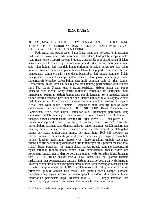 MIRZA JAYA, PENGARUH SISTEM TANAM DAN PUPUK KANDANG TERHADAP PERTUMBUHAN DAN KUALITAS BENIH PADI LOKAL SIGUPAI ABDYA PADA LAHAN KERING. Banda Aceh Universitas Syiah Kuala,2021