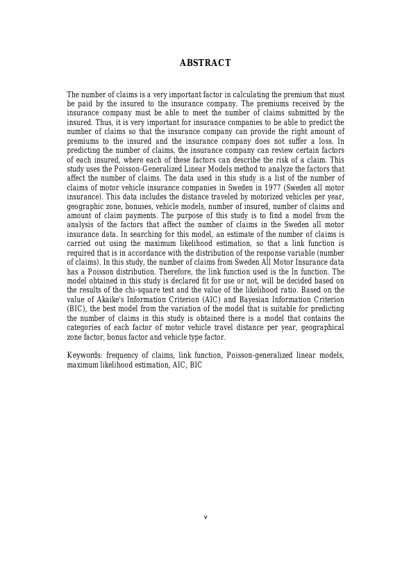 Nurmasyithah, PENERAPAN METODE POISSON - GENERALIZED LINEAR MODELS UNTUK MENGANALISA FAKTOR-FAKTOR YANG MEMPENGARUHI JUMLAH KLAIM ASURANSI KENDARAAN BERMOTOR (STUDI KASUS : SWEDEN ALL MOTOR INSURANCE). Banda Aceh Universitas Syiah Kuala,2021