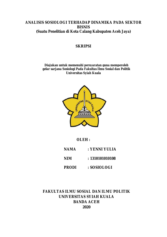 YENNI YULIA, ANALISIS SOSIOLOGI TERHADAP DINAMIKA PADA SEKTOR BISNIS (SUATU PENELITIAN DI KOTA CALANG KABUPATEN ACEH JAYA). Banda Aceh Universitas Syiah Kuala,2021