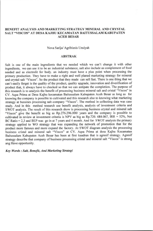 Baca Juga : ANALISIS PEMASARAN GARAM CAIR DAN GARAM KRISTAL (STUDI KASUS PADA CV. AQSA PRIMA KABUPATEN ACEH BESAR) (MUSLIADI, 2015)