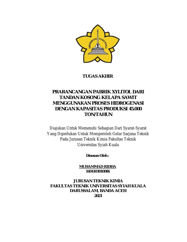 Baca Juga : PRARANCANGAN PABRIK XYLITOL DARI TANDAN KOSONG KELAPA SAWIT MENGGUNAKAN PROSES HIDROGENASI DENGAN KAPASITAS PRODUKSI 45.000 TON/TAHUN (MUHAMMAD RIDHA, 2021)