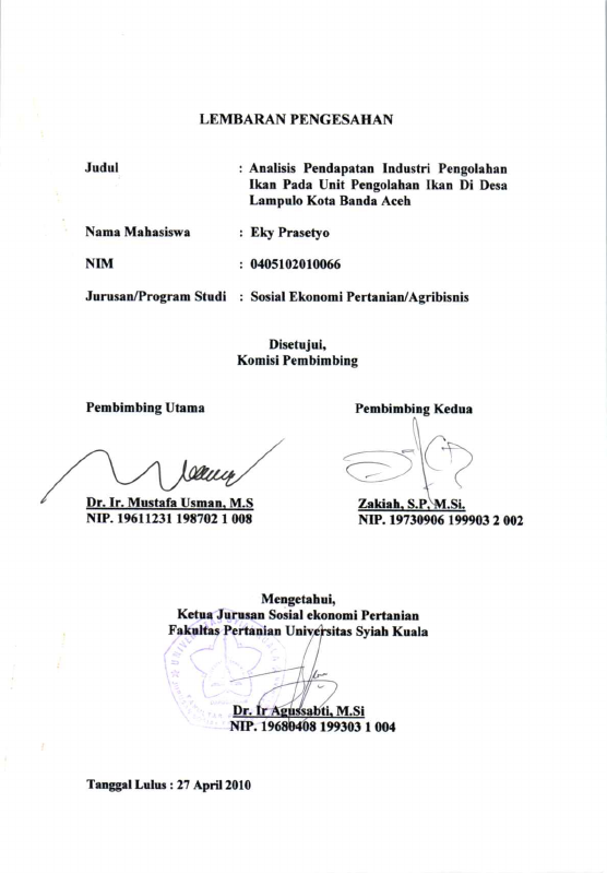 Eky Prasetyo, ANALISIS PENDAPATAN INDUSTRI PENGOLAHAN IKAN PADA UNIT PENOOLAHAN IKAN LAYARAN PERAK DI DESA LAMPULO KECAMATAN KUTA ALAM KOTA BANDA ACEH. Banda Aceh Universitas Syiah Kuala,2021