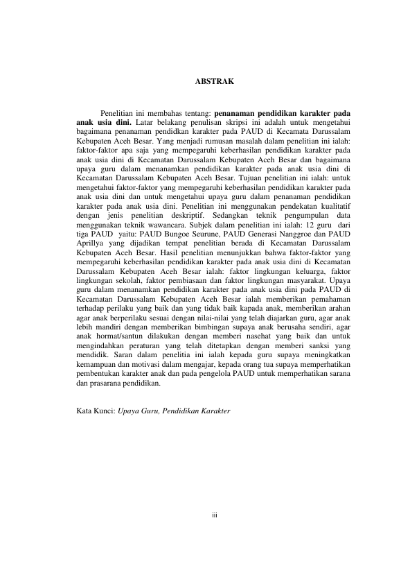 TEUKU MUHAMMAD HUSNI, PENANAMAN PENDIDIKAN KARAKTER PADA ANAK USIA DINIRN( STUDI PADA PAUD DI KECAMATAN DARUSSALAM KABUPATEN ACEH BESAR). Banda Aceh Fakultas Keguruan dan Ilmu Pendidikan,2014