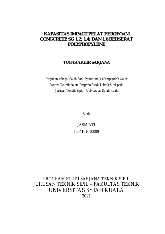 Jasmiati, KAPASITAS IMPACT PELAT FEROFOAM CONCRETE SG 1,2; 1,4; DAN 1,6 BERSERAT POLYPROPYLENE. Banda Aceh Universitas Syiah Kuala,2021
