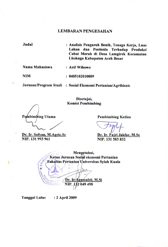 Arif Wibowo, ANALISIS PENGARUH BENIH , TENAGA KERJA, LUAS LAHAN DAN PESTISIDA TERHADAP PRODUKSI CABAI MERAH DI DESA LAMGIREK KECAMATAN LHOKNGA KABUPATEN ACEH BESAR. Banda Aceh Universitas Syiah Kuala,2021