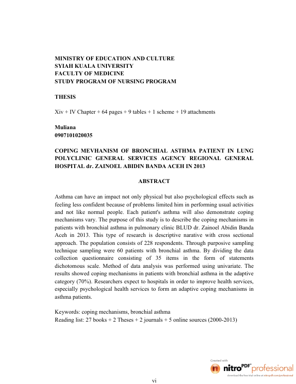 Muliana, MEKANISME KOPING PASIEN ASMA BRONCHIAL DI POLIKLINIK PARU BADAN LAYANAN UMUMRNDAERAH RUMAH SAKIT UMUM DR. ZAINOELRNABIDIN BANDA ACEH TAHUN 2013RNMEKANISME KOPING PASIEN ASMA BRONCHIAL DI POLIKLINIK PARU BADAN LAYANAN UMUM DAERAH RUMAH SAKIT UMUM DR. ZAINOEL ABIDIN BANDA ACEH TAHUN 2013. Banda Aceh Fakultas Kedokteran,2013