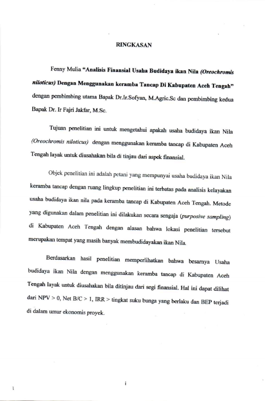 Fenny Mulia, ANALISIS FINANSIAL USAHA BUDIDAYA IKAN NILA (OREOCHROMIS NILOTICUS) DENGAN MENGGUNAKAN KERAMBA TANCAP DI KABUPATEN ACEH TENGAH. Banda Aceh Universitas Syiah Kuala,2021