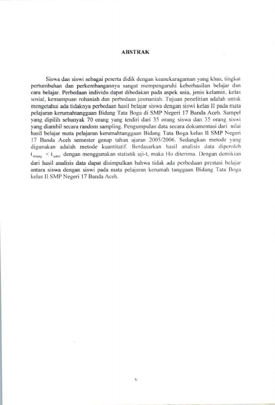 Rosdiana, PERBEDAAN PRESTASI BELAJAR ANTARA SISWA DENGAN SISWI PADA MATA PELAJARAN KERUMAHTANGGAAN BIDANG TATA BOGA KELAS II SMP NEGERI 17 BANDA ACEH. Banda Aceh Universitas Syiah Kuala,2021