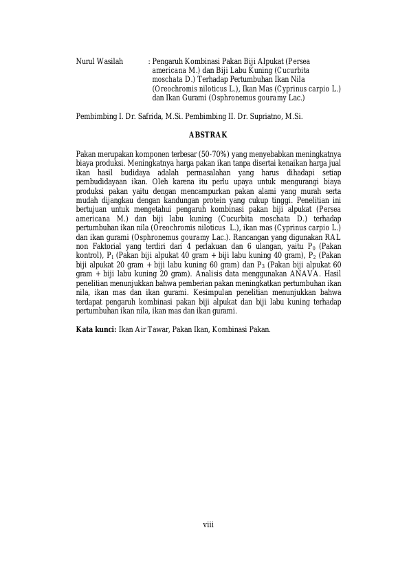 NURUL WASILAH, PENGARUH KOMBINASI PAKAN BIJI ALPUKAT (PERSEA AMERICANA M.) DAN BIJI LABU KUNING (CUCURBITA MOSCHATA D.) TERHADAP PERTUMBUHAN IKAN NILA (OREOCHROMIS NILOTICUS L.), IKAN MAS (CYPRINUS CARPIO L.) DAN IKAN GURAMI (OSPHRONEMUS GOURAMY LAC.). Banda Aceh Universitas Syiah Kuala,2021