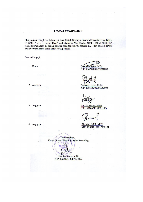 SYARIFAH NUR HABIBI, EKSPLORASI INFORMASI KARIR UNTUK KESIAPAN SISWA MEMASUKI DUNIA KERJA DI SMKN 1 NAGAN RAYA. Banda Aceh Universitas Syiah Kuala,2021