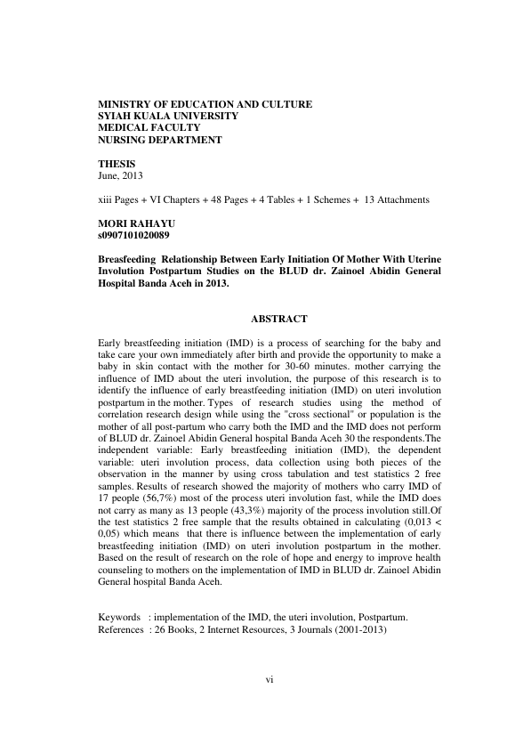 MORI RAHAYU, HUBUNGAN INISIASI MENYUSUI DINI (IMD) DENGAN INVOLUSI UTERUS PADA IBU POSTPARTUM NORMAL DI BLUD RUMAH SAKIT UMUM DAERAH DR. ZAINOEL ABIDIN BANDA ACEH 2013. Banda Aceh Fakultas Keperawatan,2013