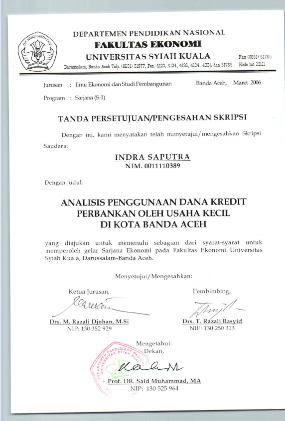 Indra Saputra, ANALISIS PENGGUNAAN DANA KREDIT PERBANKAN OLEH USAHA KECIL DI KOTA BANDA ACEH. Banda Aceh Universitas Syiah Kuala,2021