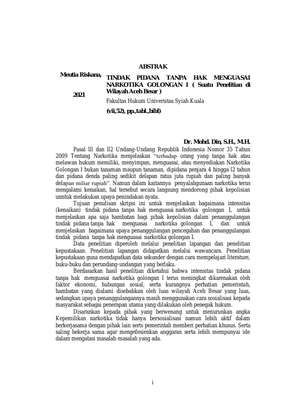 MEUTIA RISKANA, TINDAK.PIDANA,TANPA HAK,MENGUASAI NARKOTIKA,GOLONGAN.I. (SUATU PENELITIAN DI WILAYAH ACEH BESAR). Banda Aceh Universitas Syiah Kuala,2021